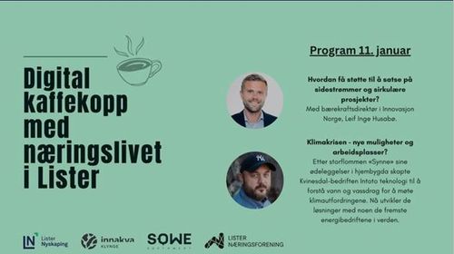 «Bli med på årets første kaffekopp med næringslivet i Lister! Møt Intoto som skapte ny teknologi for å møte klimautfordringene etter en storflom i hjembygda. I tillegg kommer bærekraftsdirektøren i Innovasjon Norge for å snakke om støtteordninger til grønne prosjekter.